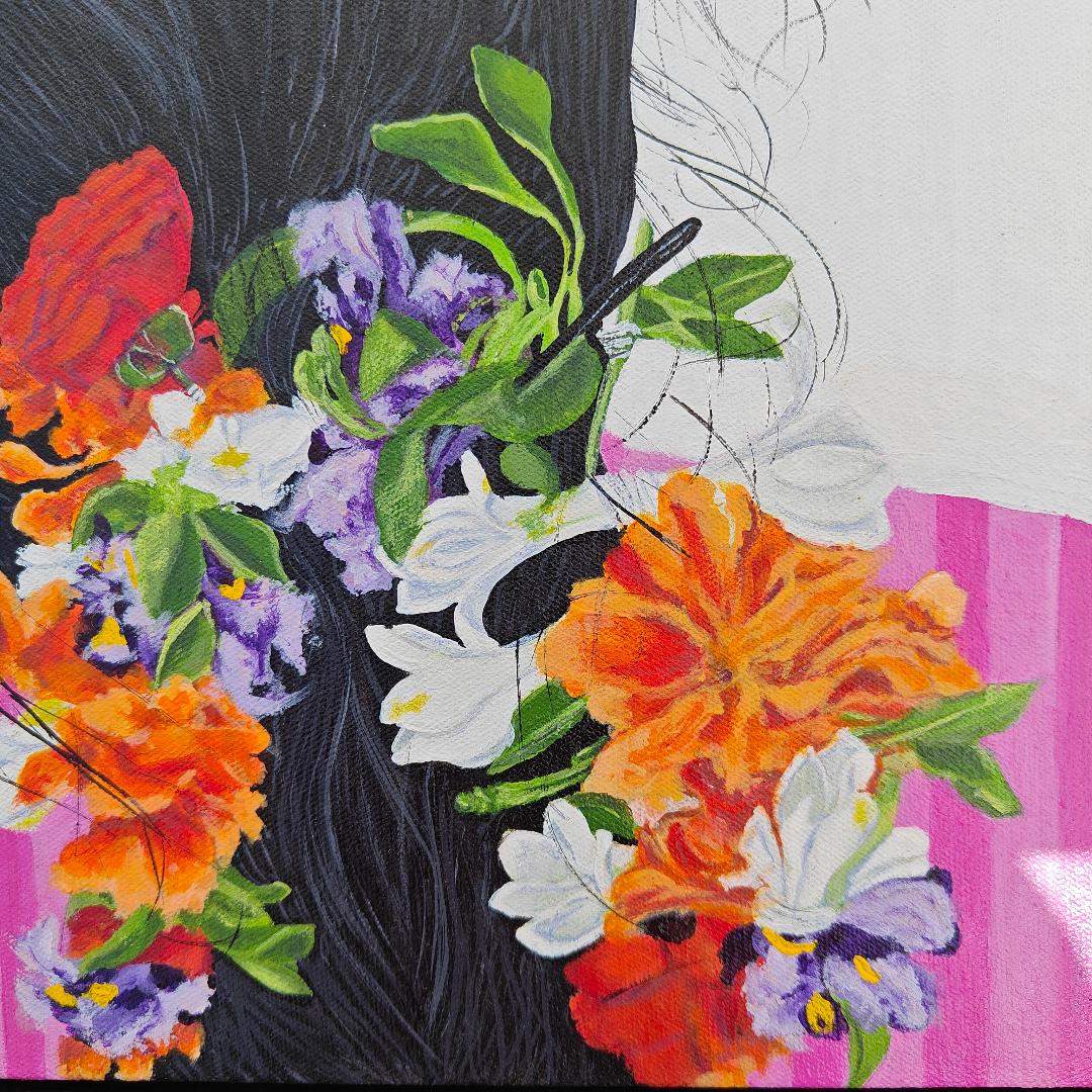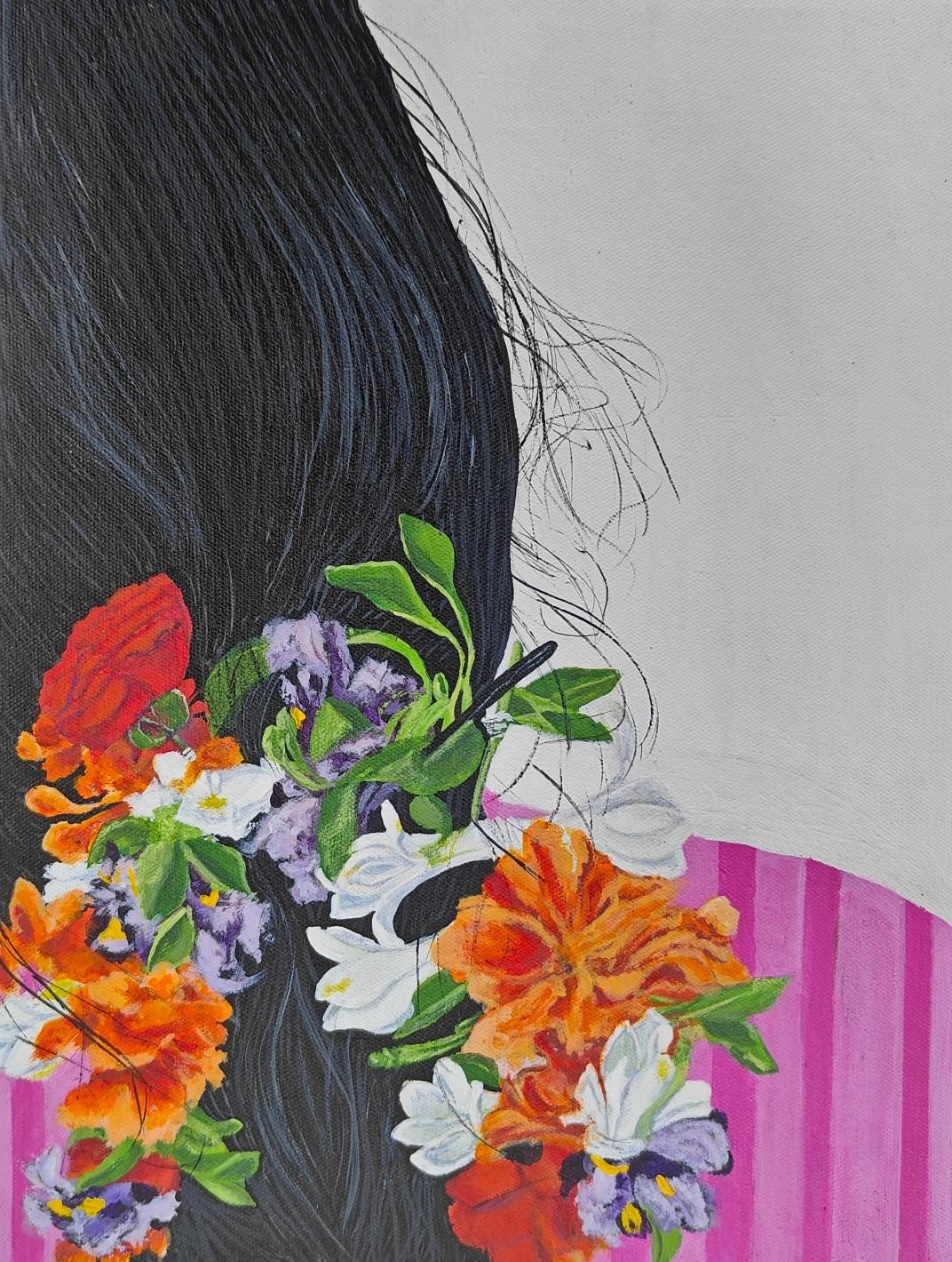 This painting is part of series. Here I have explored the profound cultural essence of Madras through the adornment of flowers by women. The artwork captures the beauty and tradition of Madras women who commonly decorate their hair with flowers, a sight deeply woven into the city’s fabric. Each bloom represents the vibrant spirit and enduring customs of the city. The flowers-december flowers, kanakambaram, red rose, jasmine, hibiscus, – are emblematic of the Madras’s rich floral heritage.