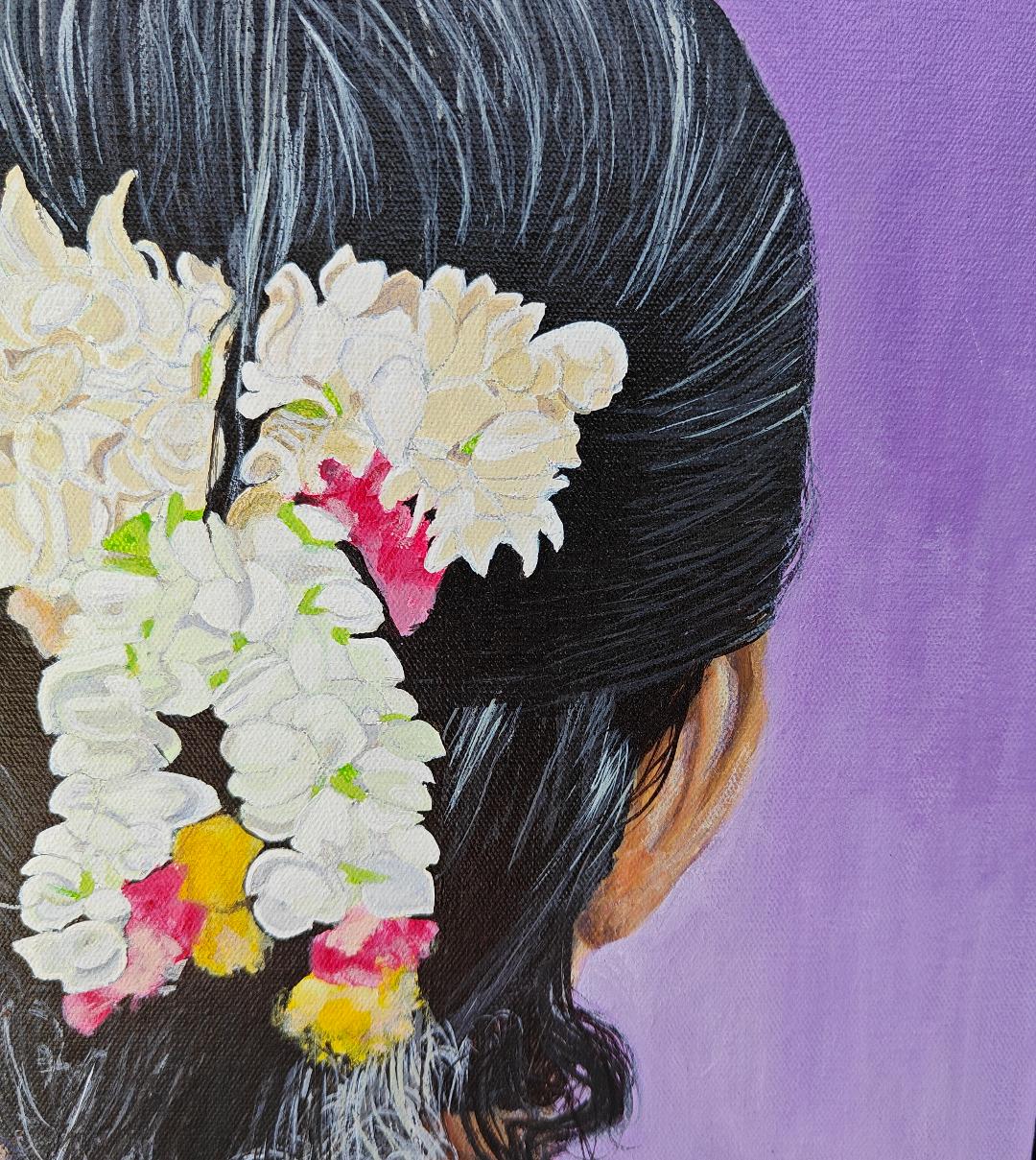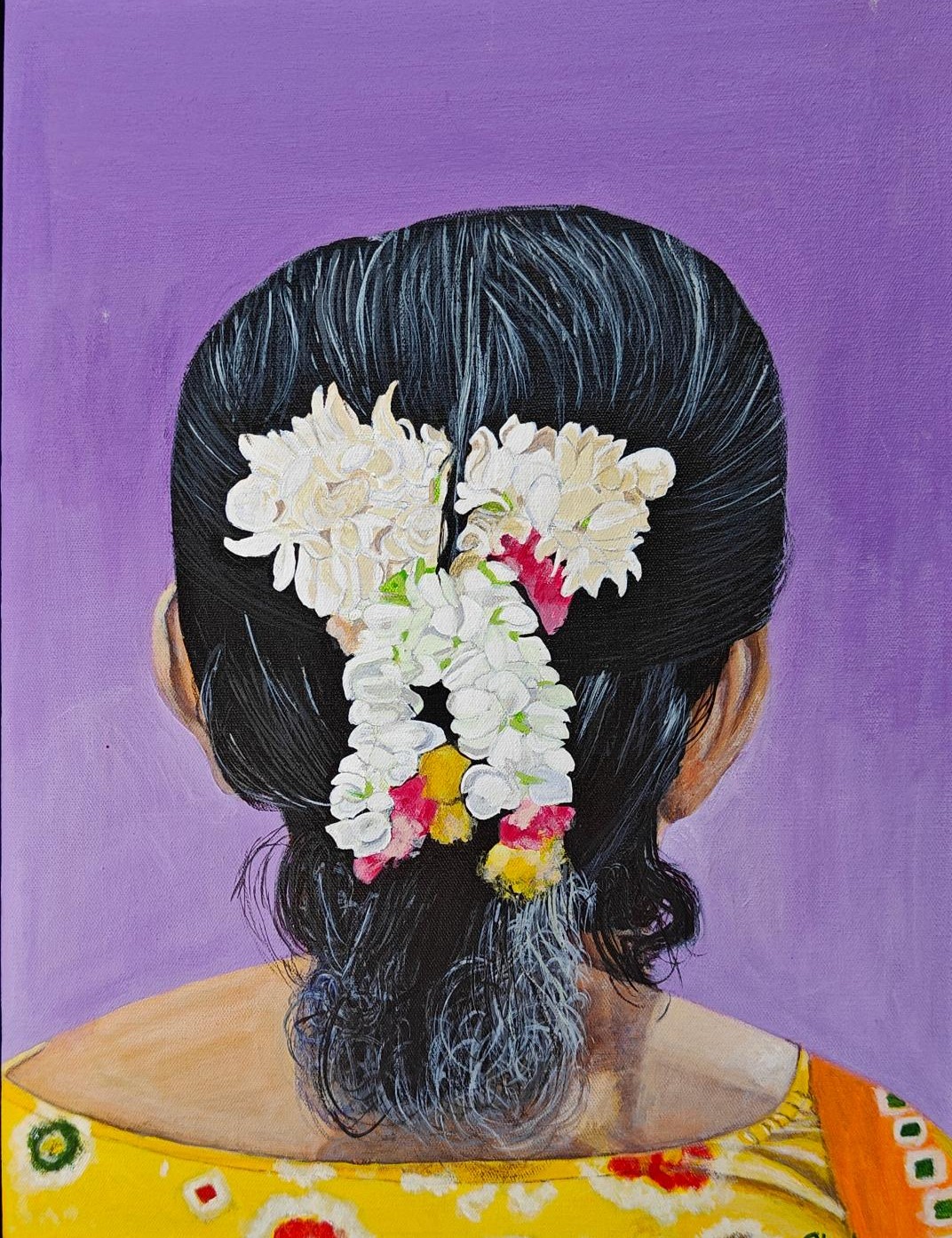 This painting is part of series. Here I have explored the profound cultural essence of Madras through the adornment of flowers by women. The artwork captures the beauty and tradition of Madras women who commonly decorate their hair with flowers, a sight deeply woven into the city’s fabric. Each bloom represents the vibrant spirit and enduring customs of the city. The flowers-december flowers, kanakambaram, red rose, jasmine, hibiscus, – are emblematic of the Madras’s rich floral heritage.